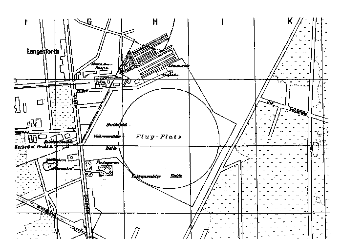Die Stader Landstraße (heute Vahrenwalder Straße) in Richtung Langenhagen. Links der Wasserturm und die Hackethal Draht und Kabelwerke, unten der Mittellandkanal. Rechts das Flughafengelände Vahrenheide. Aufnahme 1932 Stadtarchiv Langenhagen.