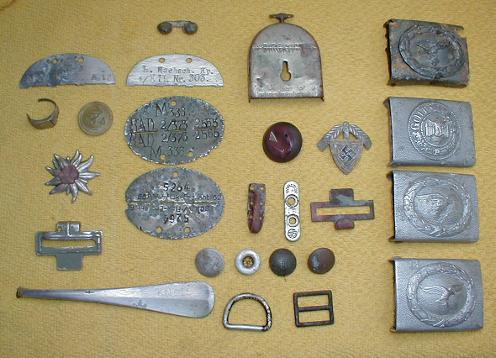 heute war für mich ein superklasse Tag, hab ich doch ein Haufen WKII Funde gemacht an einer Stelle in Ostholstein an der 1945 deutsche soldaten als Kriegsgefangene lebten. Ich habe etliche Koppelschlösser an einer stelle gefunden, die besten hab ich auf dem Foto und 4 Stück sind fast Schrott ,ein RAD Mützenabzeichen, ein Marine Glasknopf mit Metallöse von 1941, und 2x komplett Erkennungsmarke und 2x ne halbe ein Silberring der leider kaputt ist, ein Löffelstiehl mit dem Namen Knoll eingeritzt, ein Edelweis von den Gebirgsjägern, Knöpfe mit und ohne Farbeund ein Blechgehäuse mit Aufschrift Direktion. Dazu Koppelschließen, Zeltösen, schlecht erhaltene Knöpfe. alles in allem ein klasse Fundtag. Ach so ein one Penny Stück von 1936 hab ich ganz vergessen.