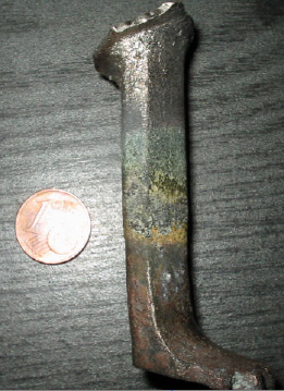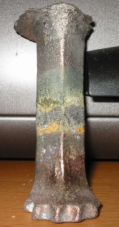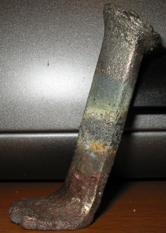es könnte sich um ein Bein von einem Grapen (Dreibeintopf) handeln. Material ist wohl eine Kupferlegierung ("Bronze"?).