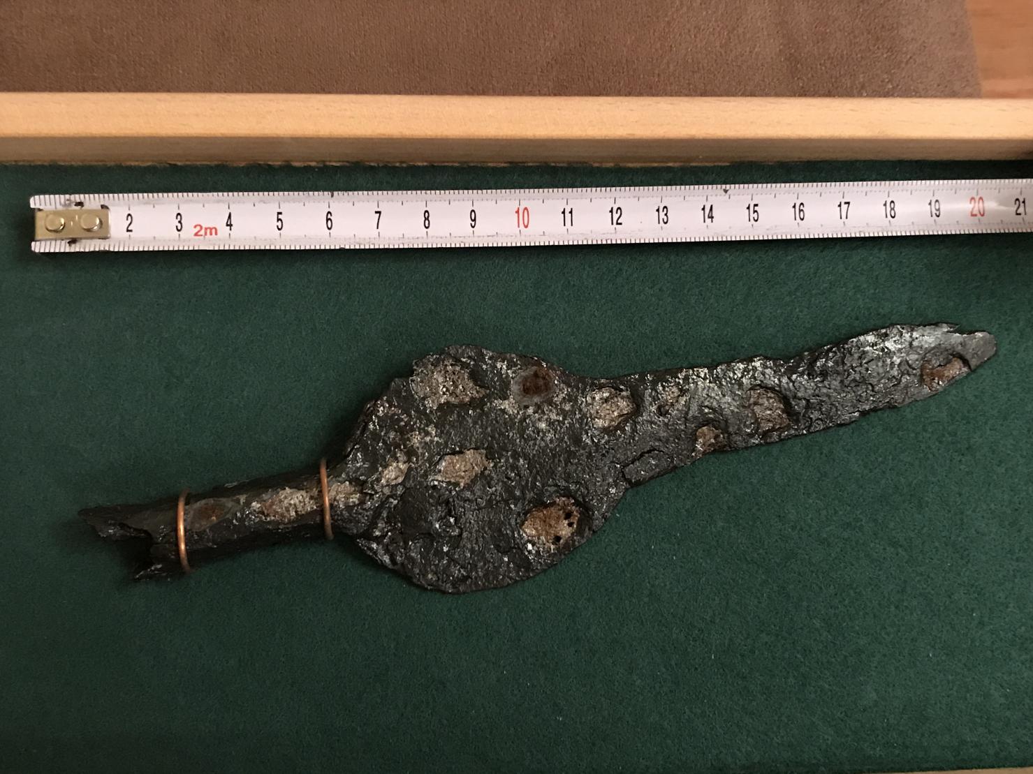 und bin zu dem schluss gekommen, daß es sich um eine römische Lanzenspitze handelt, wahrscheinlich 1-4 Jhdt. Welche Einheit ist unersichtlich, da keine nähere Ansicht möglich!