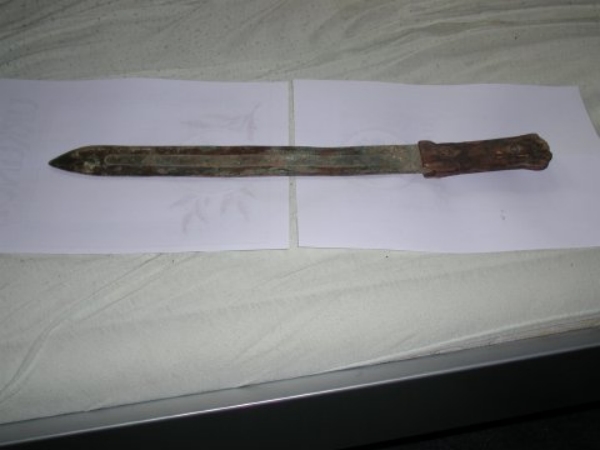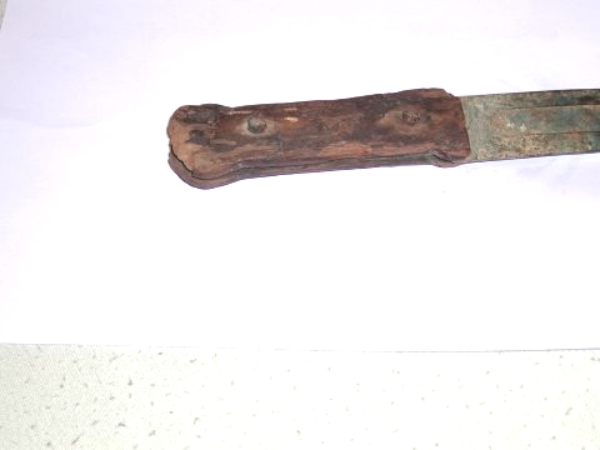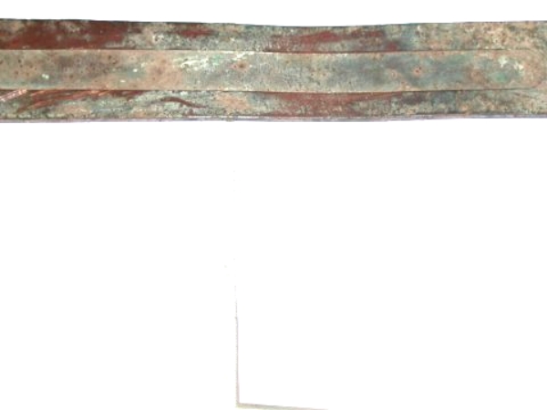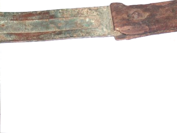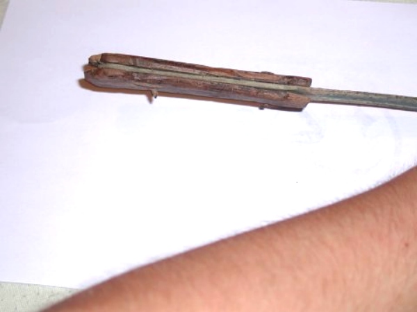 bin neu hier hab da mal was gefunden lag ca.in 5m tiefe kann mir einer sagen was das ist der griff ist aus holz und wird gehalten von 2 nägeln oä. die klinge ist aus kupfer oä. metall vieleicht auch nur ne legierung kein plan ingesamt ist das teil 46,5 cm ,die klinge ist 34,5cm lang u 3,5 cm breit ,der griff ist 12cm lang und 3,5cm breit und oben war er wohl mal abgerundet ,da die beiden nägel auf der einen seite länger sind bzw. rausgucken vermute ich das da vieleicht noch was auf den griff war