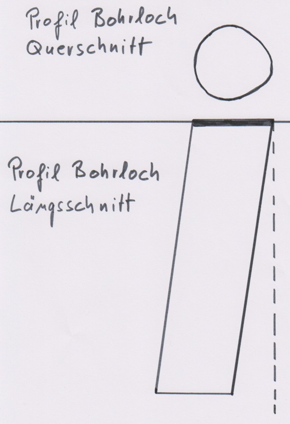 Die ovale bzw. eiförmige Form der Bohlöcher entsteht immer dann, wenn mit einem Fiedelbohrer tief in das Material gebohrt wird. Durch das Ziehen und Drücken mit dem Bogen wird das Bohrholz immer oben an der Lochwandung angedrückt. Manchmal kann durch diese ovale Lochform im oberen Lochbereich sogar der Aufenthaltsbereich des Handwerkers festgestellt werden. Durch den ständigen Druck an einer bestimmten Stelle wurden die Löcher nicht völlig senkrecht in den Stein getrieben; sie weichen im Längsprofil deutlich sichtbar von der "Idealform" ab und zwar immer genau der "Tropfenspitze" entgegengesetzt, was völlig logisch ist. Siehe beiligende Skizze (Längsprofil etwas übertrieben dargestellt).