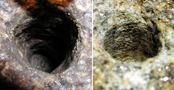 Auf dem Boden der Löcher sind eindeutige glatte vom Schleifen entstandene Spuren zu erkennen. Auch die Rillen (auf dem Bild sehr gut ersichtlich) sind typisch für diese Bohrmethode.