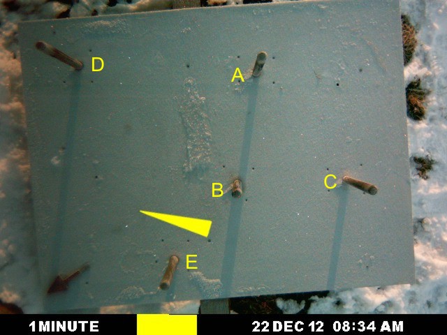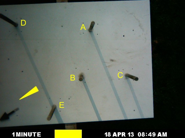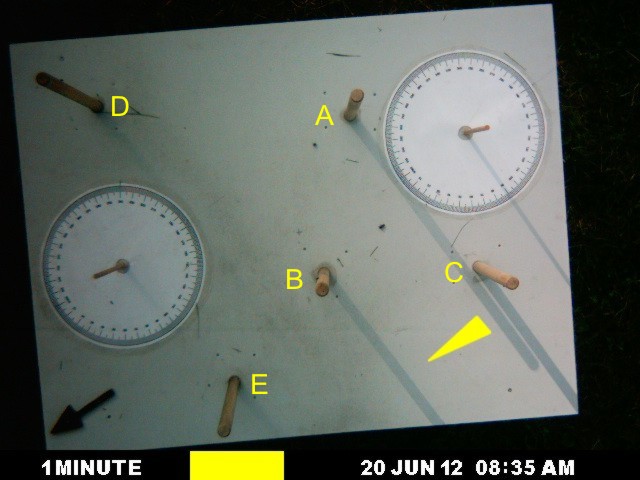 Es gibt wieder Neues zu berichten bezüglich Kalenderstein. Da – wie „Insidern“ bekannt sein dürfte – eine Beobachtung des Schattenwurfes der Stäbe, die man in die fünf Löcher stecken kann, wegen ringsum stehender Bäume nicht möglich ist, habe ich die Löcher im Maßstab 1:1 auf eine Platte übertragen und diese in der exakt gleichen Ausrichtung etwa 100 Meter unterhalb des Steines im freien Gelände aufgestellt. Um brauchbare Ergebnisse zu erhalten, habe ich über der Platte (mit Stäben in den Löchern) eine Vorrichtung aufgebaut, auf welcher ich eine Zeitrafferkamera montieren konnte. Diese Kamera machte direkt über der Platte mit den Stäben alle Minuten ein Bild mit Datum und Zeitstempel und zeichnete diese auf einem Speichermedium auf. So verfüge ich nun über eine große Menge von Bildern, mit denen ich die Funktion dieses Steines gut dokumentieren kann - ohne auf (ungenaue) Computeranimationen angewiesen zu sein. Nach einem Jahr Beobachtung liegen nun die Ergebnisse vor, die sich wie folgt darstellen: