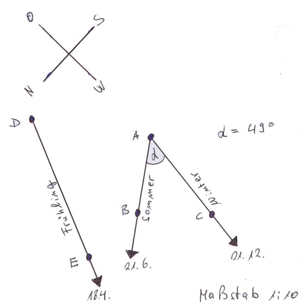 4) Die Feststellung des Schattenwurfes ist natürlich nur bei schönem Wetter möglich; darum ist eine Beobachtung genau an den Sonnwendtagen nicht immer möglich.