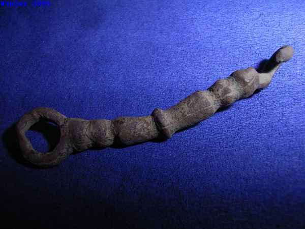 ich vermute, dass es sich um ein Teil einer Pferdetrense handelt. Ich habe ähnliche Stücke aus Eisen gefunden.