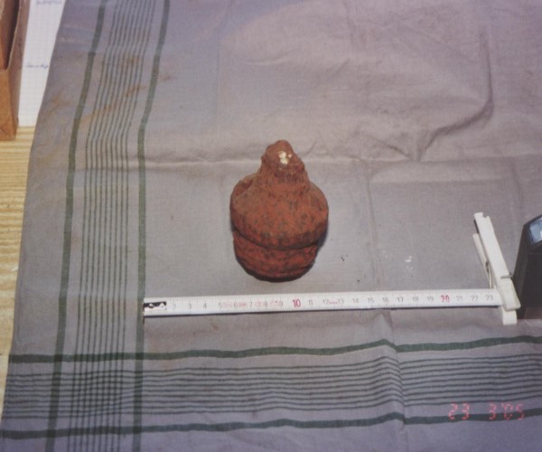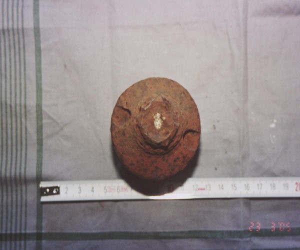 Hier möchte ich mal mein deformierten Hülsenboden-Rest posten. Ich glaube das es von den Abmaßen her, die ich schon mal in dem anderen Beitrag angegeben hatte, dass es sich um eine 8,8 cm gehandelt haben muß.