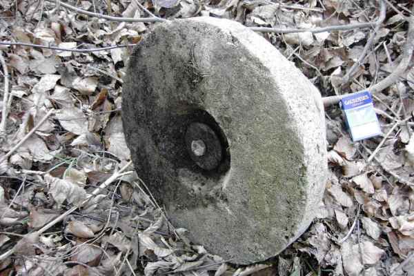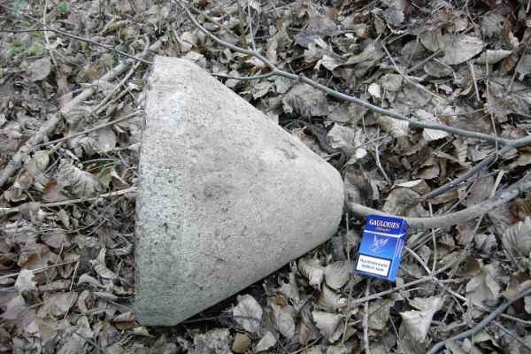 Betonkegel, gefunden an einem Westwallbunker am Rande eines Waldweges im Saarland. Diente er um mittels Stacheldraht den Waldweg zu sperren als "beweglicher Zaunpfahl?