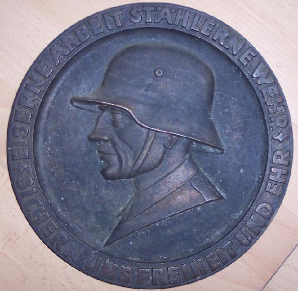 kann mir jemad näheres zu dem gezeigten Objekt sagen? Hab ich bei Opa am Dachboden gefunden. Durchmesser 23,5cm. Text: "Eiserne Arbeit Stählerne Wehr Sichern Uns Freiheit Und Ehr". Auf der Rückseite ist kein Hersteller oder so eingraviert.