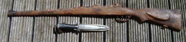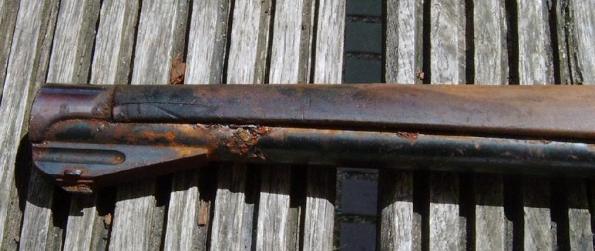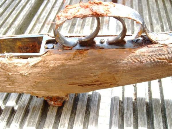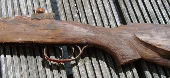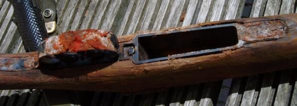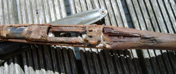Das Gewehr war übrigens in Stoff gewickelt und in einem Dachrinnenfallrohr eingelötet - leider nicht 100 % dicht, so das die Feuchtigkeit durchkam und sein Rostwerk beginnen konnte.