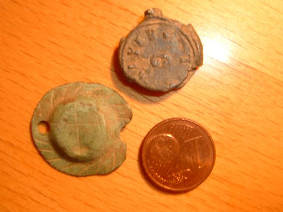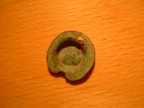 Bild1/2: -das grün oxidierte Teil mit Stanzungen = Gewandspange oder Tellerchen für Hartz5-Empfänger....?