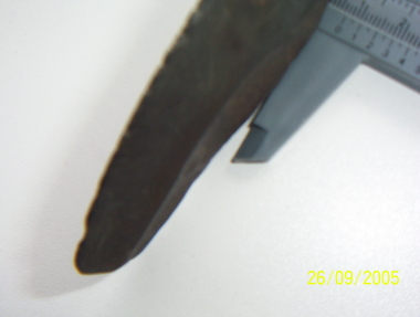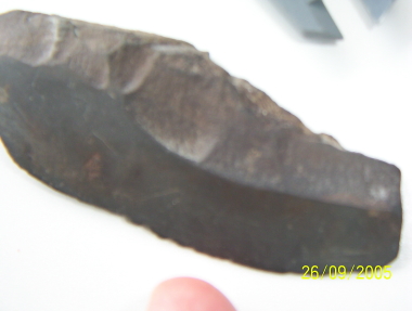 Außerdem sieht das Ding so aus wie ein Abschlag von einem Flintstein, der vielleicht noch ein wenig nachbearbeitet wurde, vielleicht aber auch nur zufällig so abgestoßen ist. Und ob die Klinge überhaupt von Menschenhand aus einem Stück Flintstein o.ä. abgeschlagen worden ist, ist auch nicht eindeutig erkennbar... Zeig doch mal schärfere Bilder!