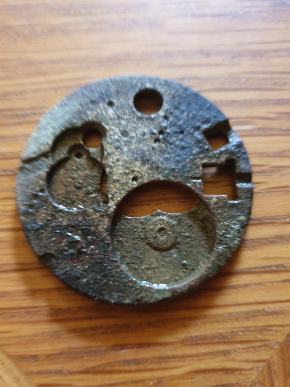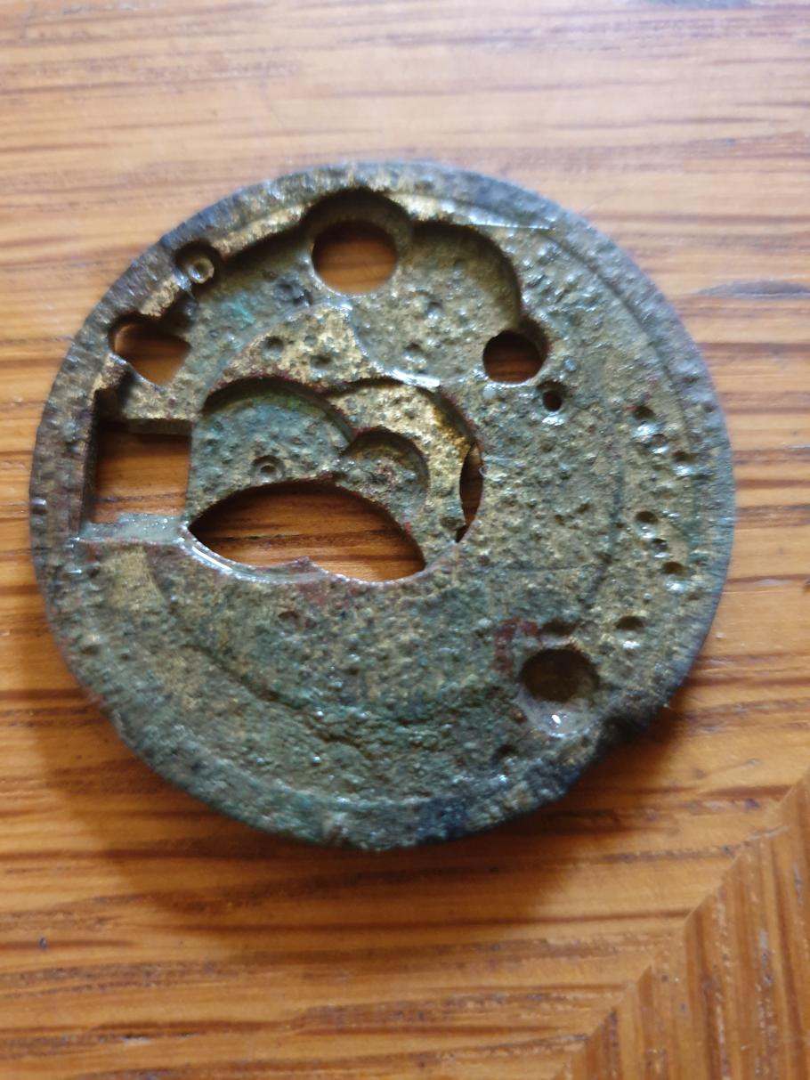 Mal wieder ein Ackerfund, in 5 cm Tiefe. 4 cm Durchmesser u 3 mm Stark, könnte vielleicht Uhrenteil sein.Stichworte: - -