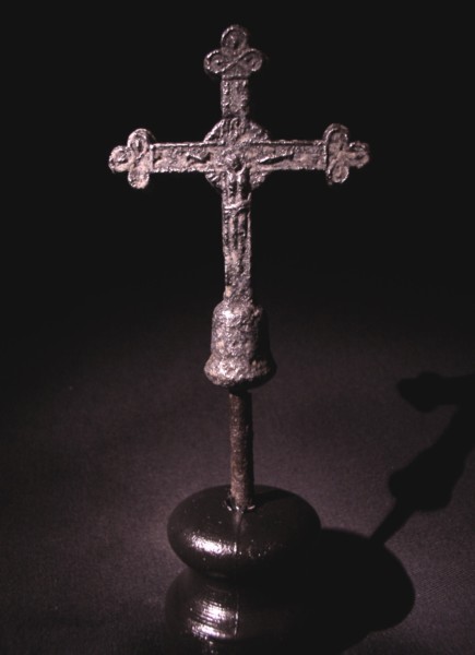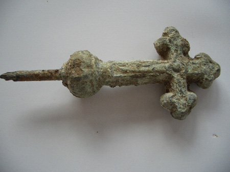 Falls an dem Kreuz noch ein Gewinde erkennbar ist,dürfte es sich um eine alte Sargschraube handeln,mit der der Deckel auf dem Unterteil befestigt wurde.