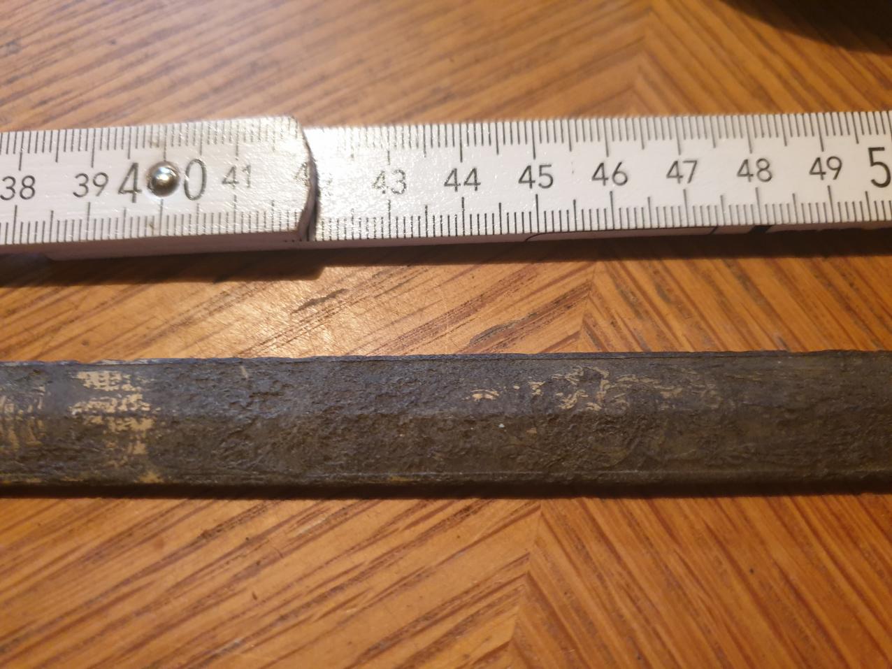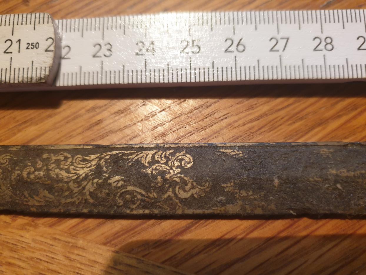 Mal ein Dachbodenfund. Ein Degen, Gesamtlänge 81 cm, die Spitze ist abgebrochen, 18mm Breit und 5mm Stark. Ab cm 13 ist was erkennbar und auf der Rückseite ist nichts oben außer unten am Griff ein Zeichen. Wer weis was dazu? Wie Alt wird der sein?Stichworte: - -