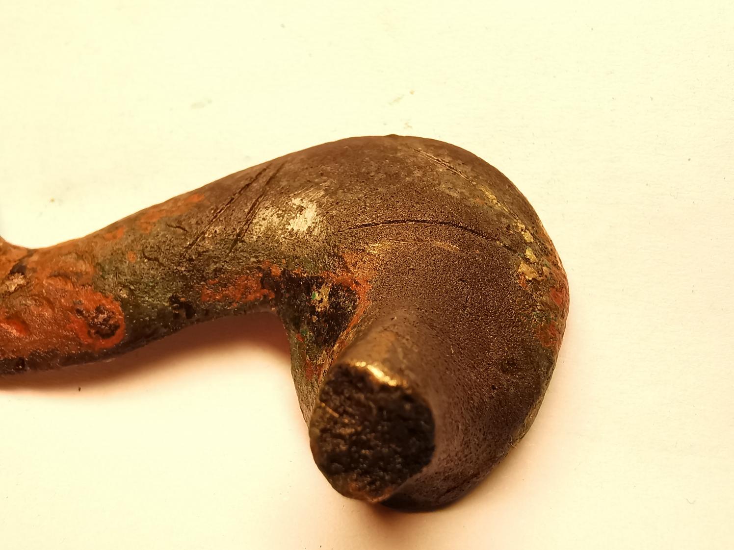 Ich versuche es mal sanft etwas zu reinigen, Verzierungen sind es für mich auch, "wellenförmige" und Striche, oben am dicken Teil.