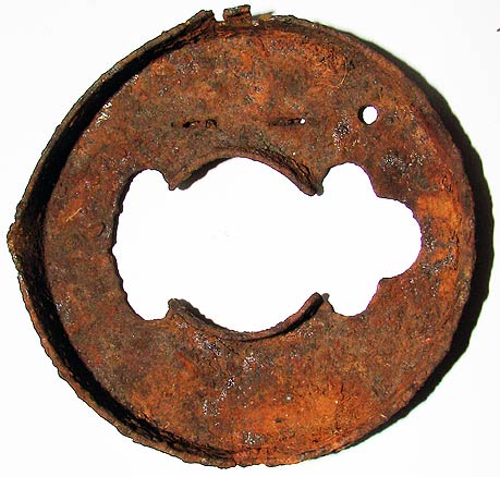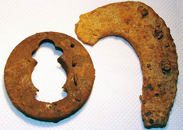 Das hab ich gestern bei einer Stunde wahllosen Sondeln (nur so zum frische Luft schnappen) im Wald gefunden. Klar, das rechte ist ein zwei Drittel erhaltenes Hufeisen (ziemlich alt). Aber was ist das Runde Ding? Es hat einen Durchmesser von ziemlich genau 7 cm, ist 12 mm hoch, 1 mm dick und lag ca. 10 cm tief.