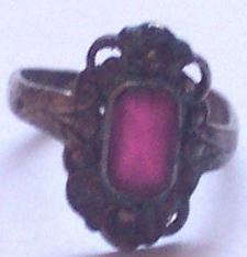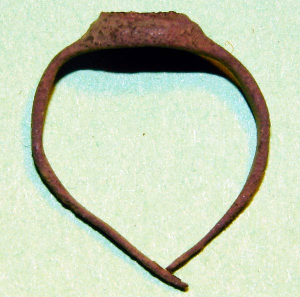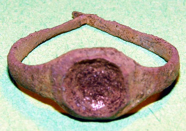 Und dort buddelte ich heute in etwa 10 bis 15 cm Tiefe dieses Ringlein aus. Es ist nicht richtig rund, sondern unten offen, weshalb ich zuerst an ein billiges Kinderspielzeug dachte. Allerdings hat es auch schon eine recht dicke Patina angesetzt. Bisher habe ich es nur mit heißem Wasser und Seife gereinigt und an der Fassung mit einem Zahnstocher rumgekratzt - drunter schimmert es verräterisch golden. Mein Garett Ace-150 zeigt das Stück auch nicht im Eisen- oder Silber-, sondern im Goldbereich an - dort werden aber auch andere Buntmetalle wie Kupfer oder Messing angezeigt.