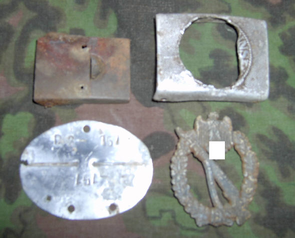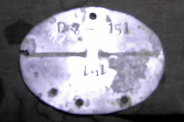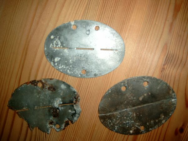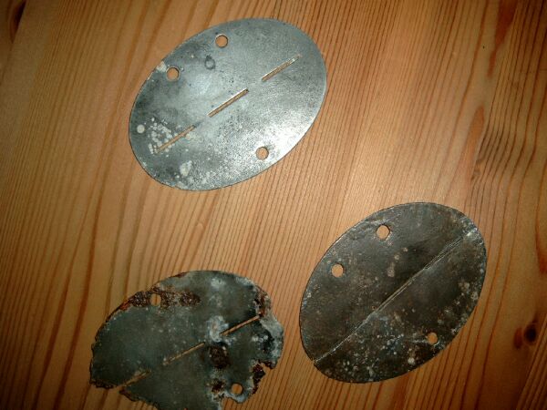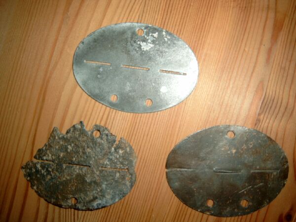 Ich kriege z.Z. kein Bild hin, ist aber auch nicht so wichtig. Stellt euch doch einfach mal ne deutsche Erkennungsmarke aus dem 2. Wk mit dieser Stempelung vor. Nur eben am Schraubstock selbst gefeilt. Der Träger hat wohl das Originalstücke verloren und Blankomarken hatten sie wohl nicht mehr. Die liegen nämlich alle hier im Wald rum.