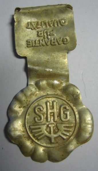 Das nächste Fundobjekt ist eine Alu "Plakette" mit der Inschrift "Garantie für Qualität - SHG" bei Google finde ich nur Selbsthilfegruppen und eine Schweizerische Hämophilie Gesellschaft. Das dürfte aber nicht zutreffen, ich denke mehr an Landwirtschaft / Industrie aufgrund des Hammers mit den 2 Schwingen rundherum.