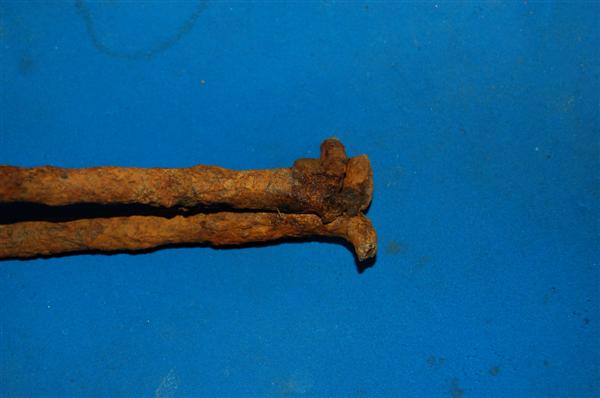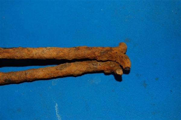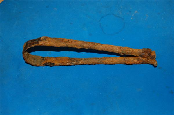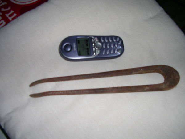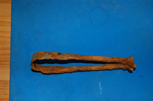 @Oelfuss: Du hast da eine Brennzange. Damit wurde das rotglühende Hufeisen auf den Pferdehuf aufgelegt, wodurch es sich plan einbrannte und Halt bekam. Die Enden der Zange passen in die Öffnungen für die Nägel im Hufeisen.