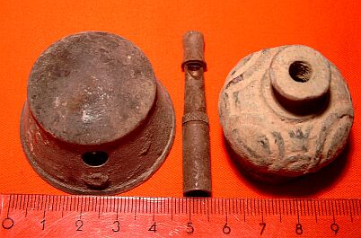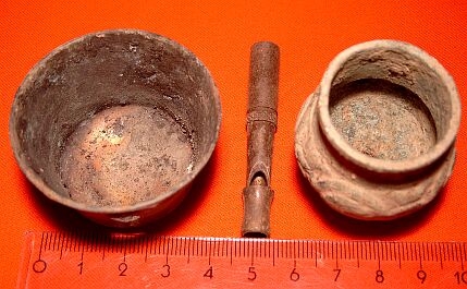 In dem linken Töpfchen ist mal was verbrannt worden, die Asche krümelte noch raus. Das Ganze war mal vergoldet, innen sind noch Reste davon.