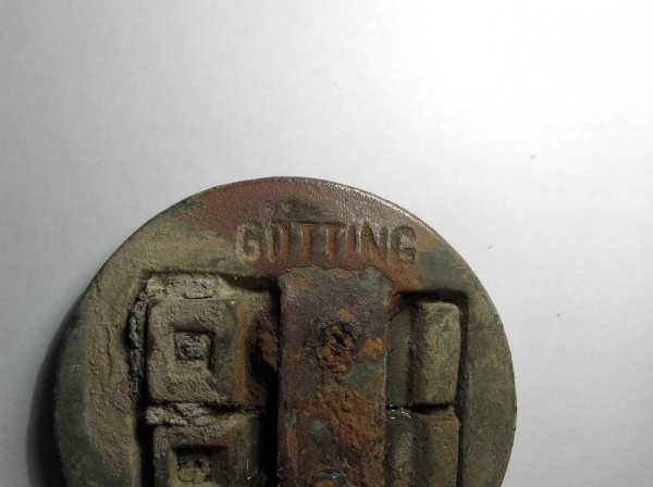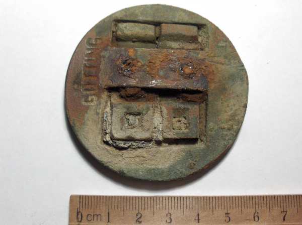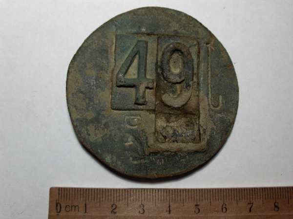 Moin moin. Hab gestern nach langer Zeit mal wieder meine Sonde ausgeführt und dabei dieses komische Teil gefunden. Auf der Vorderseite steht eine 49, auf der Rückseite ist "Götting" eingestanzt.