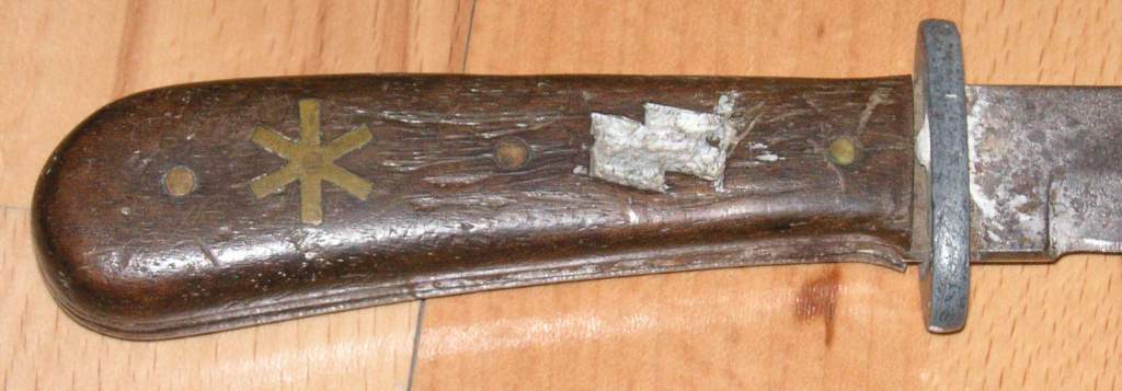 ist wohl wirklich ein sog. graben oder nahkampfdolch wie es sie so und ähnlicher form seit dem ersten weltkrieg gab. die runen waren wohl wiklich mal doppel sig runen ich tippe auch auf selbst reingeschnitzt. das andere symbol ist u.a. das divisions abzeichen der 6.ss.geb.div. "nord" gewesen.