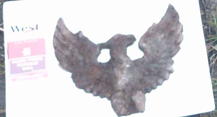 vor Jahren hab ich mal diesen Adler gefunden. Mittlerweile auch schon das Unterteil. Es ist aber kein Hakenkreuz wie man vielleicht vermutten könnte. Das Unterteil bestht nur aus Flammen und halt den Beinen des Adlers.