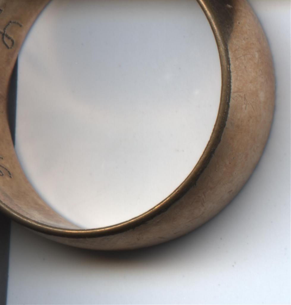 Das Material sieht mir nicht nach Gold aus, bestenfalls vergoldet. Im Ersten Weltkrieg kam man nur sehr schwer an Edelmetalle. Viele Deutsche waren ab 1914 dem Aufruf gefolgt "Gold gab ich für Eisen" und hatten Schmuck und sogar ihre Vorkriegs-Eheringe aus Gold gegen eiserne getauscht. Die Chance ist also gut, dass ein 1916 gekaufter Ring aus einem unedlen Metall war. Jedenfalls aber ist es unabhängig vom Materialwert ein schönes Stück.