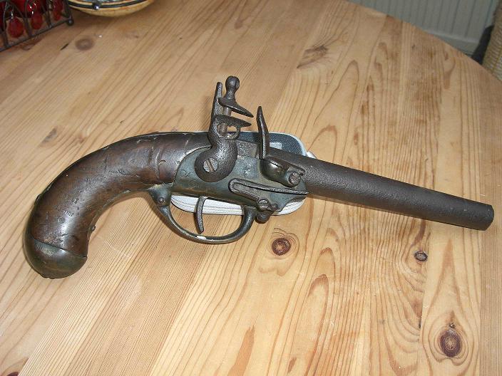 "Bei der fraglichen Pistole handelt es sich um die französische Kavalleriepistole M 1777, von der es zwei aufeianderfolgende Muster gegeben hat. Das fragliche Stück gehört der 1. Variante an. Allerdings fehlt bei ihr der ehemals vorhandene Gürtelhaken, welcher an der Schlosskastenunterseite im Abzugsbügelbereich verschraubt war. Den Abdruck des Gürtelhakens im Schaftholz links kann man noch erkennen.