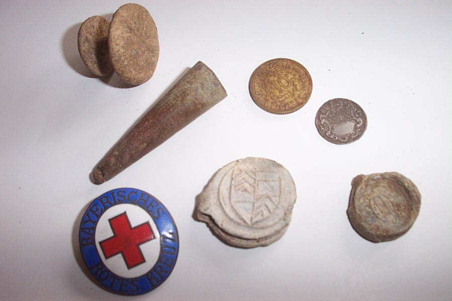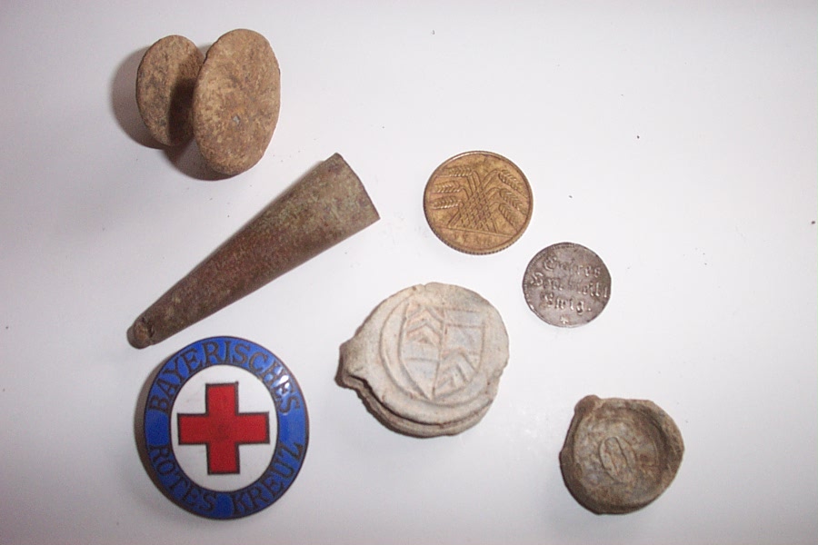 eine kleine Silbermünze auf der einen Seite ist ein Wappen 17-17 -und drüber steht ULM und auf der anderen seite steht Gottes Wort bleibt Ewig: ein 10 Reichspfenig1934 f . ein Knopf zwei Bleiblombenein und ein uvo irgendwas ? na und das beste ist das Abzeichen !! kann mir jemand sagen ob das aus dem WKII ist ?