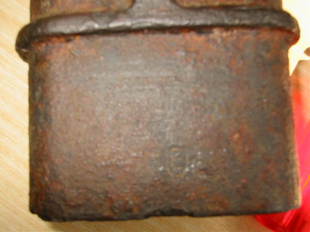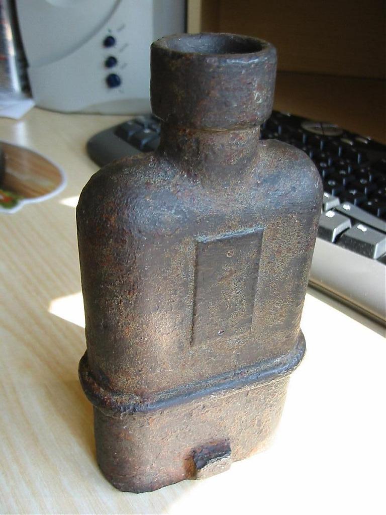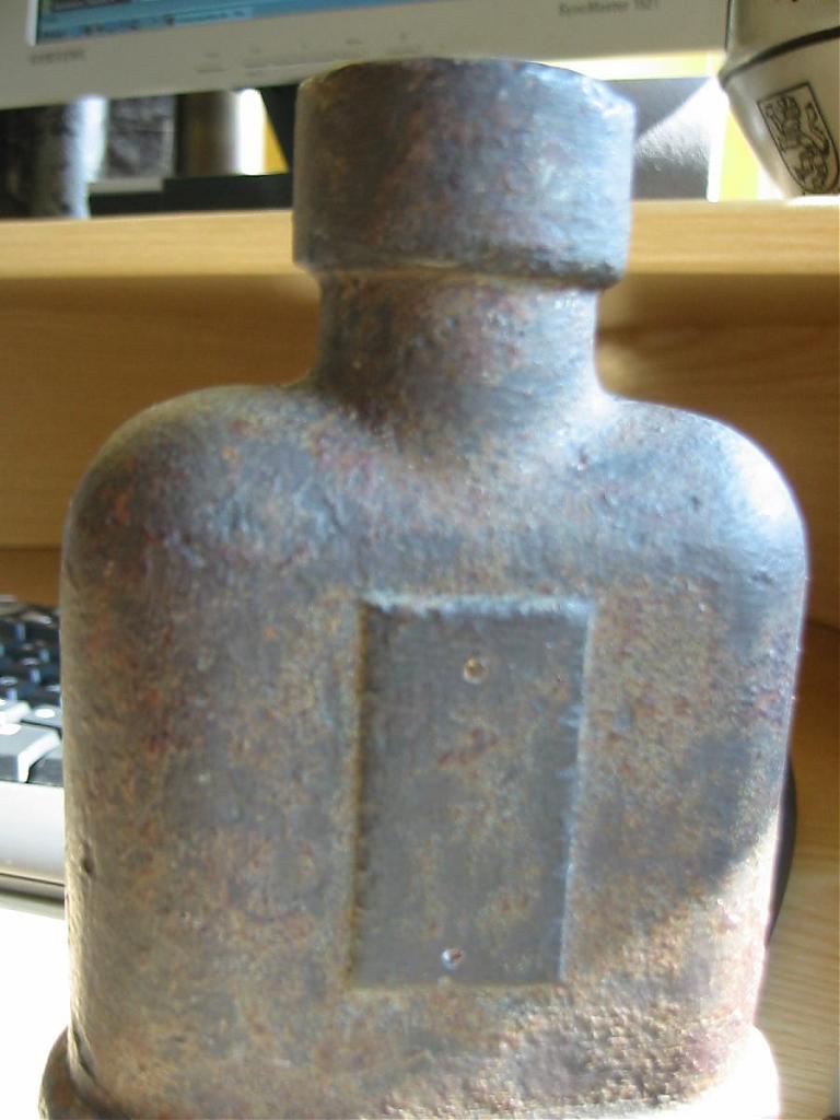 Ich fand neulich am Rheinufer diese Eisenflasche, der Boden sowie ein Befestigungshaken an der Seite sind mir leider weggegammelt. Die Flasche selbst ist sehr massiv und besitzt an der Seite eine Nummer (300393?) und ein Firmenlogo (ein "E" in einem Wappenschild).