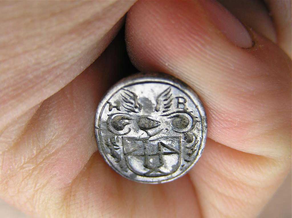 @Rolskaya: Übrigens ein sehr schöner Fund. Der Schild ist meiner Meinung nach nicht geteilt, wir sehen eine Art Hausmarke (unten ein "x", oben 2 mal eine "4" (gespiegelter Vierkopfschaft). Hausmarken und ähnliche Zeichen sind oft sehr schwer zu bestimmen. Hier kannst du eventuell Glück haben, weil dein Fundstück wohl relativ spät datiert werden kann, die Hausmarke und die Initialen des Besitzers noch gut zu erkennen sind.