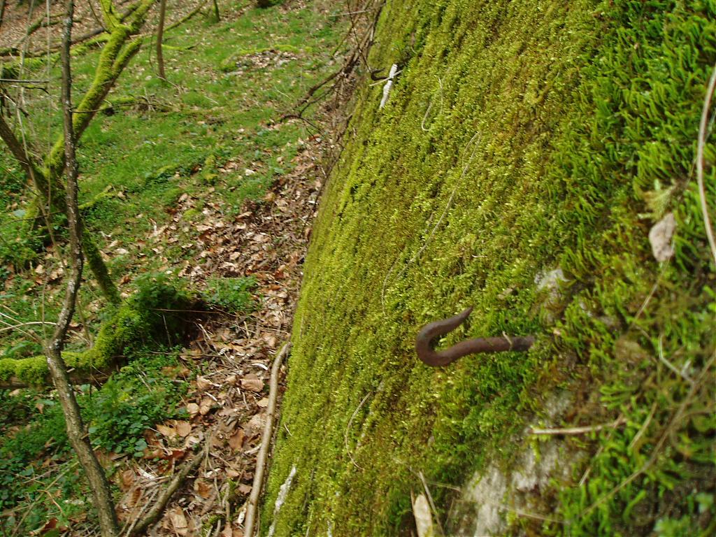 Kann gut sein, denn das war am Anfang der Panzermauer, soweit ich mich erinnere. Links davor war mal als Übergang eine Höckerlinie. Aber ich habe auch schon mal gehört, dass diese Panzerhindernisse eingetarnt wurden. Obwohl das wiederum eigentlich nicht nötig gewesen wäre, weil die Mauer jetzt dichter Wald, der von oben kaum einsehbar ist, umgibt! Aber der kann ja auch in der Zeit gewachsen sein. In der Mauer waren auch zusätzliche Halterungen, vielleicht find ich davon noch 1 Bild.