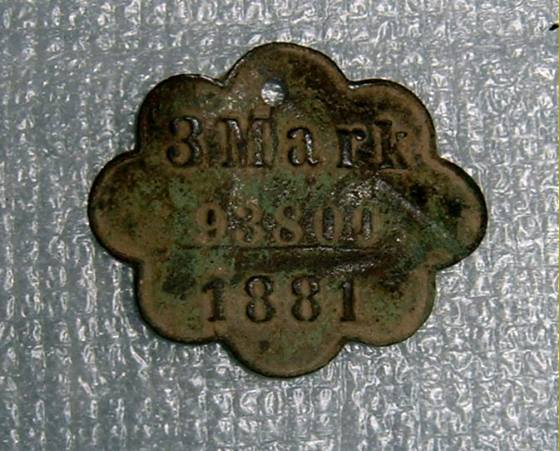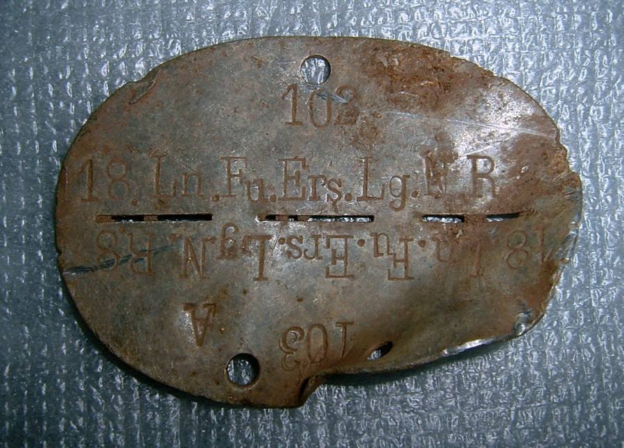 Die Erkennungsmarke lag ca. 25cm tief mitten in einer abseits gelegenen Wiese. Leider hat die Plakette ein paar Grabhammerschläge abbekommen.
