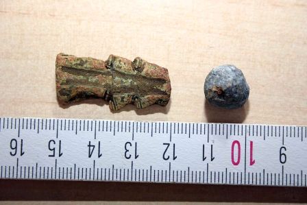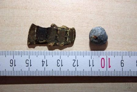 eine Murmel also Vorderladerkugel kann ich wenigstens erkennen...das andere ?? tippe aber mal auf ein Teil eines Führungsrings von einer Granate..