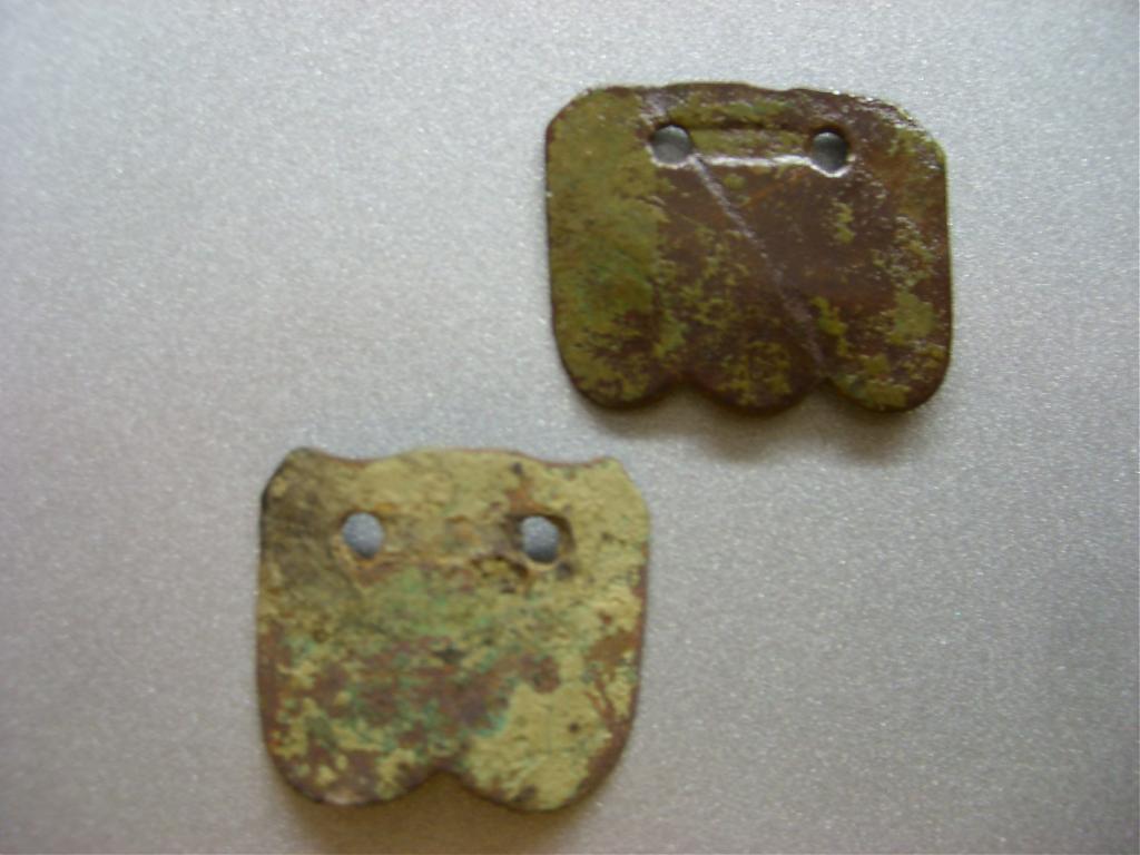 es handelt sich mit großer Wahrscheinlichkeit um Blechbeschläge der Kinnriemen von milit. Helmen des 19. Jhdts. Hin und wieder wird in den Internetforen eine römische Herkunft dieser Teile diskutiert (Teile des römischen Schuppenpanzers). Dies ist meiner Ansicht nach eher unwahrscheinlich, da sie auch außerhalb des römischen Siedlungsgebietes häufig gefunden werden und insgesamt einen eher neuzeitlichen Eindruck machen.