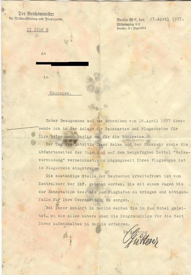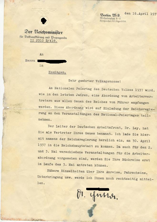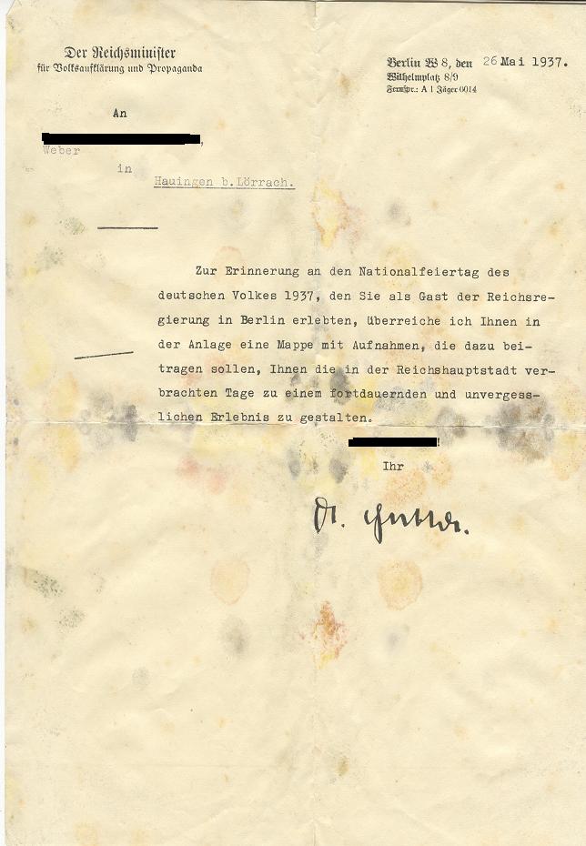 1937 Gauleiter Badens. Eingeladen am 30.April bis 3.Mai zum Nationalfeiertag des Deutschen Volkes 1937 in Berlin.