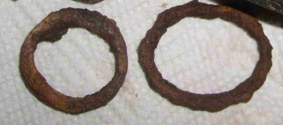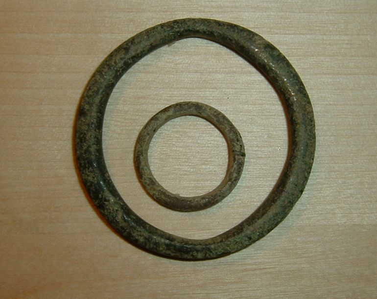 ...Metallringe in einer Tiefe von ca. 30cm am Ackerrand am Wochenend ausgebuddelt. Lagen knapp beieinander, und sind wohl kupfern. Der kleine ist im Durchmesser bei 19mm/3mm dick, der größere liegt bei 44mm/6mm dick.