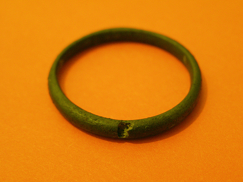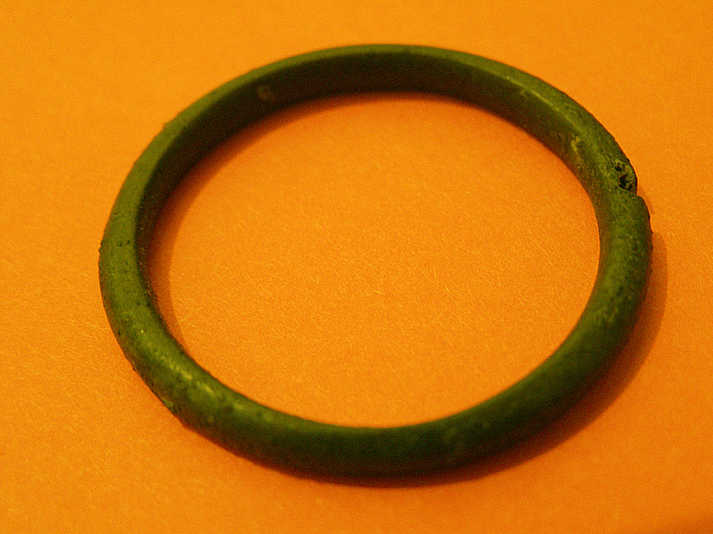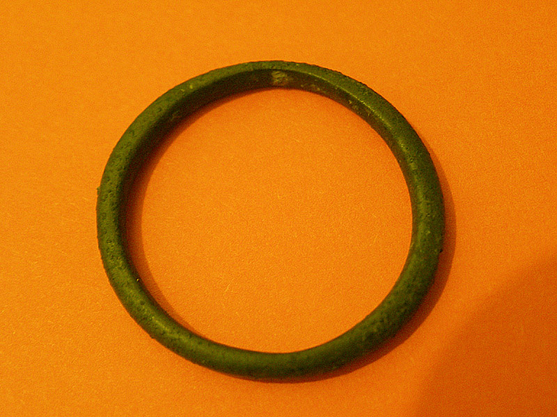 Als Vergleich mal ein ähnlicher Ring aus der Bronzezeit, im Durchmesser ca.35mm und innen hohl, aus dünnem Bronzeblech geschmiedet. Es handelt sich dabei um einen Wendel- oder Schläfenring. Im Gegensatz zum Ring vom Bohrwurm ist das hier kein Nutz-, sondern ein Schmuckring. Ist denke ich auch verständlich bei dem dünnen Blech das da keine Zugkräfte wirken können. Bei dem von mir gezeigten Ring ist auch eine Abnutzung auf der Innenseite zu erkennen, allerdings nur an einer Stelle. Diese Abnutzung entstand nur durch das Eigengewicht und jahrelanges tragen...