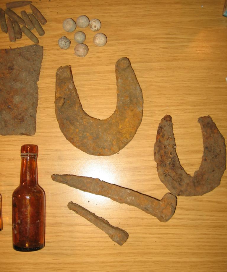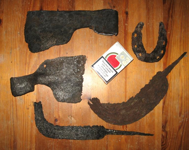 Kann man sie evtl zeitlich einordnen? Zumindest die eine Axt und das Hufeisen dürften vom Verwitterungsgrad bereits einiges auf dem Puckel haben.