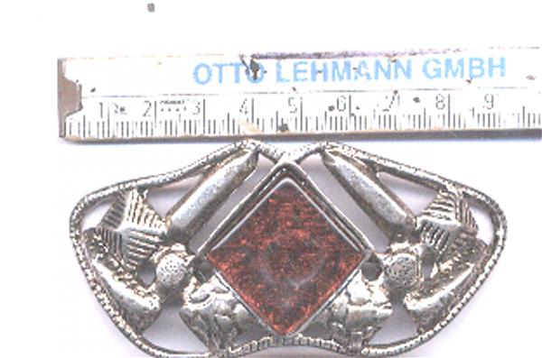 habe beim aufräumen habe ich dieses stück gefunden und kann mich noch dran errinnern das ich dies mal als kind von meiner oma bekommen habe,habe aber keine ahnung was das ist wie alt u.s.w.der dunkelrote stein ist nicht glatt sondern hat wie ein großes S in der mitte drin