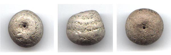 vor einigen Jahren haben bei einer Begehung auf einem Acker in Bremen u.a. die auf dem Bild abgebildete „Tonkugel“ gefunden. Sie hat eine Höhe von etwa 2 cm, die Breite der leicht konisch geformten Kugel beträgt ca. 2, 5 cm und das von oben nach unten durchgehende Loch hat einen Durchmesser von nur 0, 15 cm. Auf der Unterseite hat die Kugel deutliche Benutzungsspuren (glatt poliert). Zeitlich wäre dieser Fund in die ersten fünf Jahrhunderte n. Chr. einzuordnen.