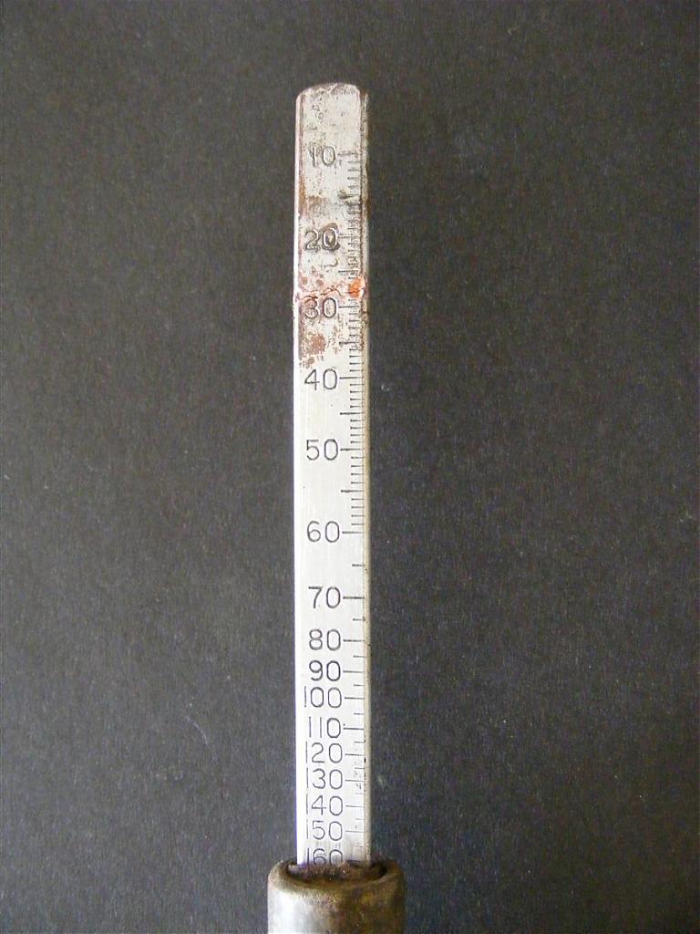 Der "Gnubbel" links im Bild wurde aufs Ventil gedrückt und der Luftdruck presste den Meßstab heraus, so daß der Druck abgelesen werden konnte.