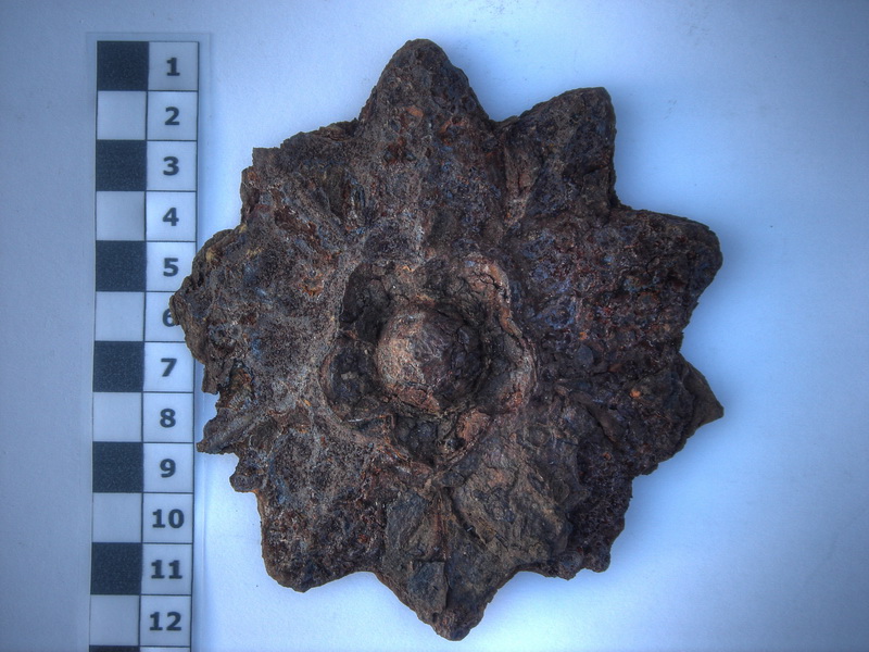 Ich vermute mal es ist ein Beschlag denn im Zentrum ( auf der Rückseite) sieht man den Rest vom Nagel der wohl von der anderen Seite eingeschlagen wurde. Wird wohl die gleiche Funktion gehabt haben wie ein Ziernagel und sollte etwas schmücken ( Kutsche, Hauseingang?)