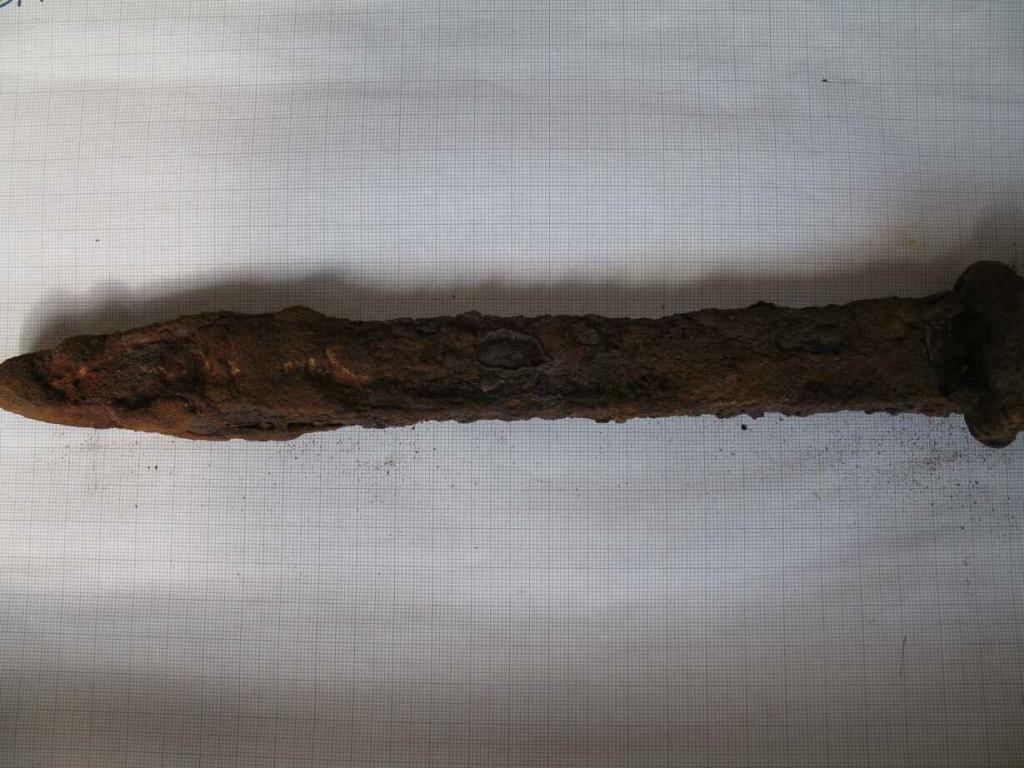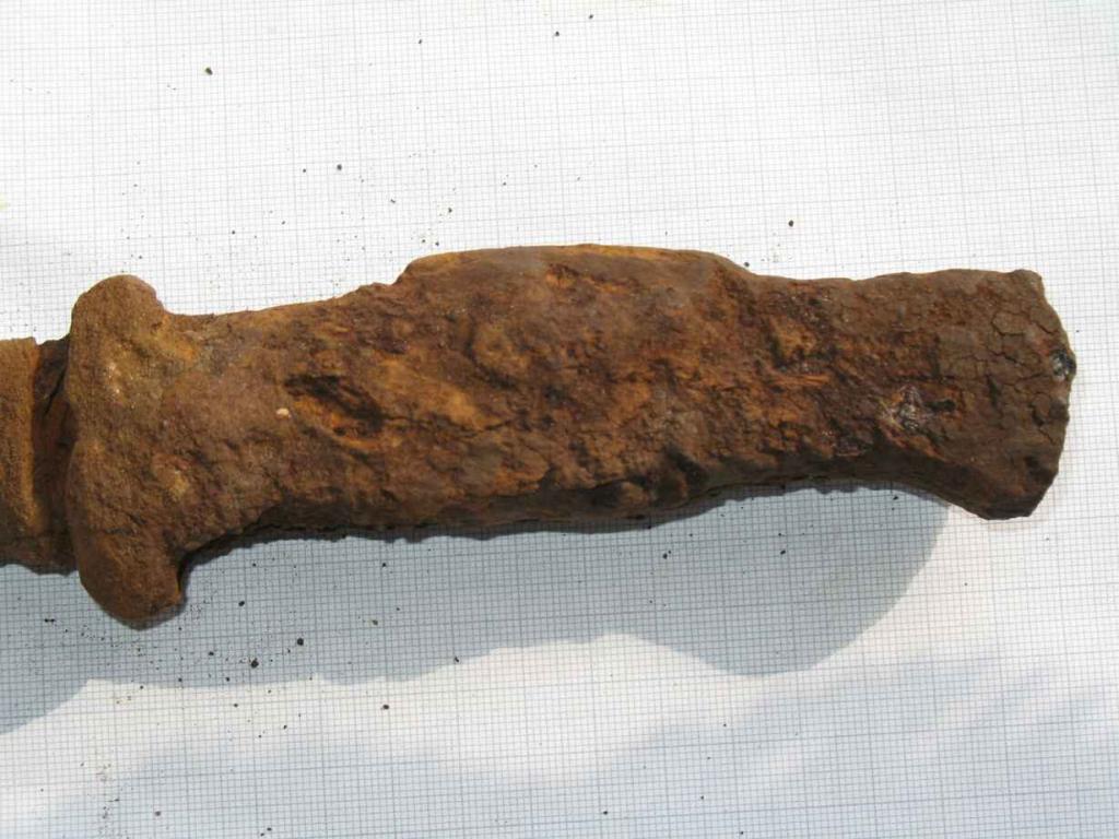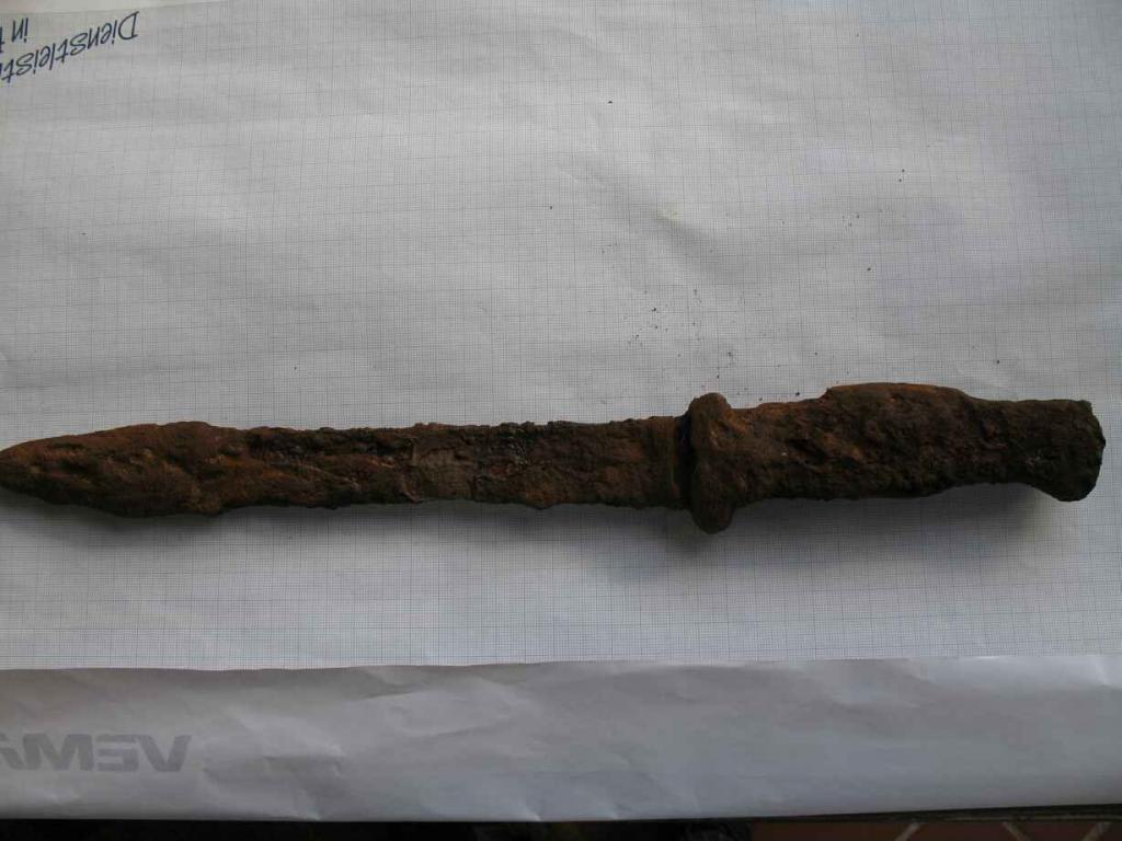 Glaube es handelt sich um ein deutsches K98 Bajonett ausn Wk2. Wenn du den gröbsten Rost entfehrnts, würde man es besser erkennen. Was da zerbröselt, sind wahrscheinlich die Überreste der Scheide. Einfach mal abkratzen die kannste leider eh nicht mehr retten.
