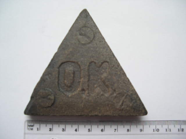 Neben einer herrlichen Erfrischung per Pedes, gibt es auch so einiges zu entdecken. Neben vielen interessanten Vertretern aus Flora und Fauna, fand meine Tochter einen gebrannten Stein in Form eines gleichseitigen Dreieckes. Das Teil ist von der Beschaffenheit her wie ein Klinker oder Riemchen, welcher gerne für Bodenbeläge genommen wird. Das verblüffende ist der Schriftzug "O.K." und ein Gebilde auf der Rückseite(erinnert mich irgendwie entfernt an Radioaktivität
