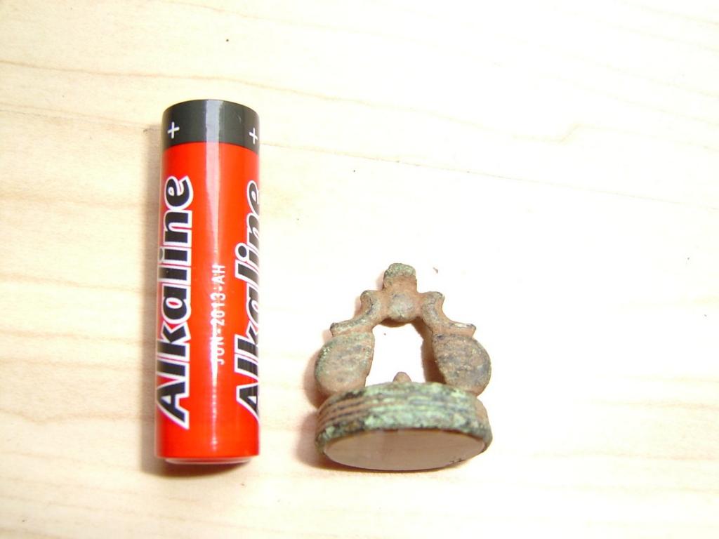 ich war heute mal wieder die Sonde schwingen ueber einen ganz normalen Acker. Nichts besonderes, keine nennenswerten Gehoefte etc. in der Naehe. Fettes Signal bekommen und dann dieses "Ding" ausgegraben.