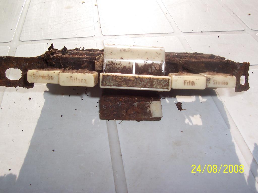 auf dem linken knopf steht sprache drauf,daneben der knopf Brillanz...ganz rechts der knopf Studio und daneben der film...in der mitte der fehlt es leider.ich dachte erst ein teil eines autoradio mit stationstasten....kann es aber nicht sein..denn film stand da niemals drauf